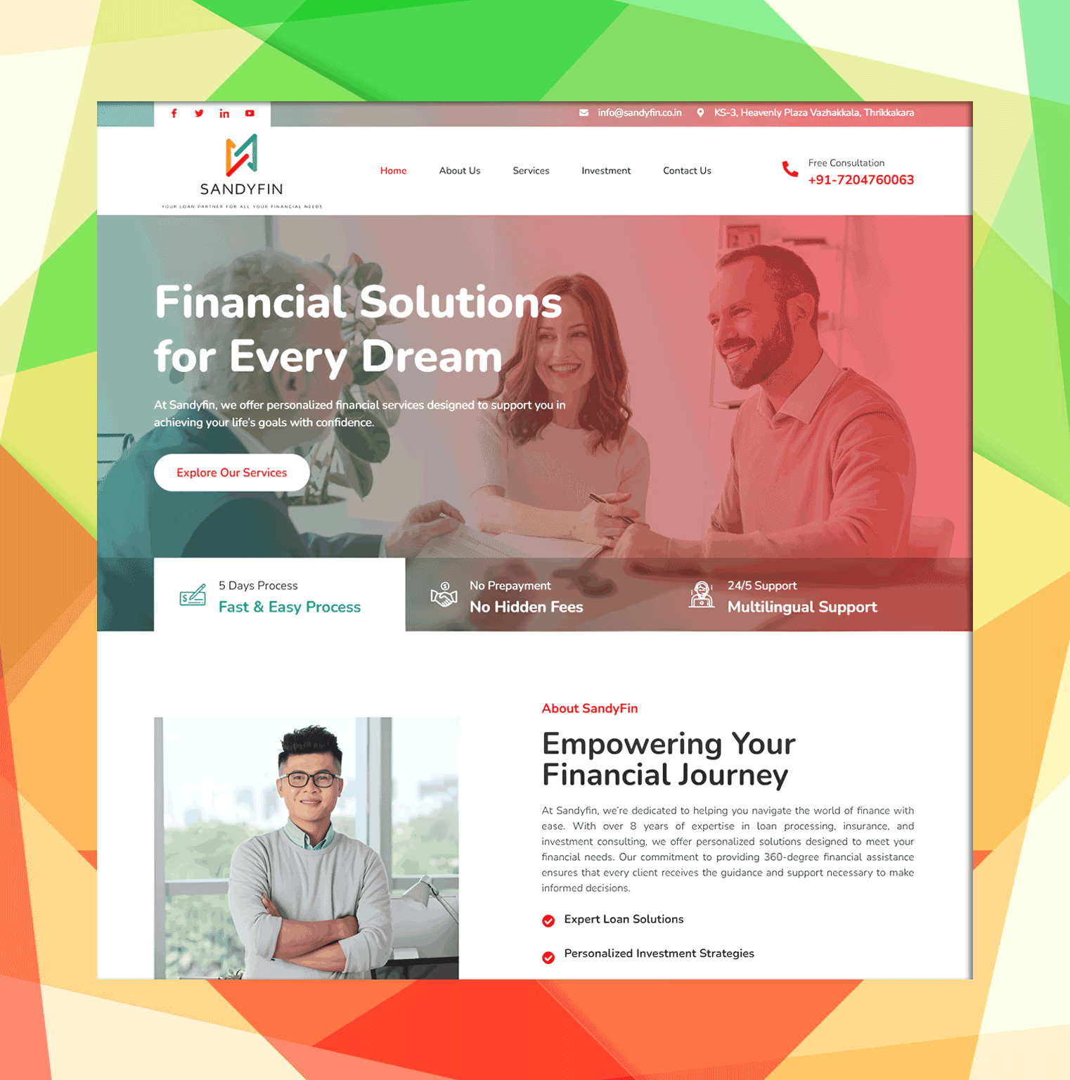 Sandyfin Private Limited has established itself as a trusted name in the financial industry. Specializing in loan processing (DSA), insurance, and investment consulting, we manage an investment portfolio worth over 8 crores, helping our clients achieve their financial goals with confidence. Our expertise spans across all types of loan facilitation, comprehensive insurance solutions, and tailored investment strategies.